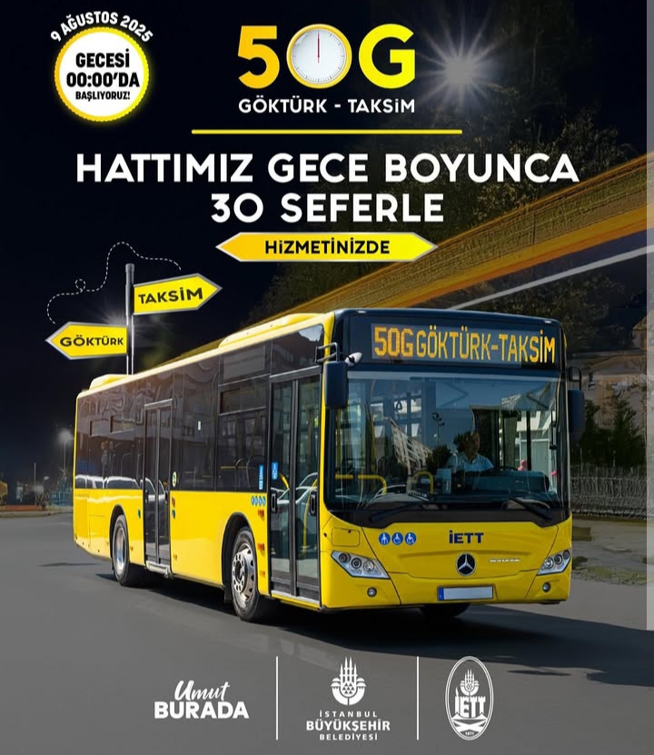 İETT ve Eyüp Sultan belediyesi resmi Instagram hesaplarından duyurdu. 9 Ağustos tarihinden itibaren 50 G numaralı otobüs hattı gece boyu 30 sefer yapacak.