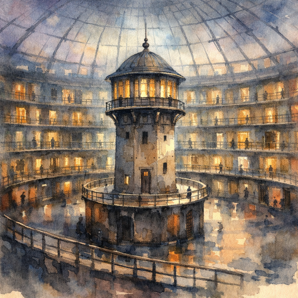 İlk bakışta kulağa eski bir hapishane modeli gibi geliyor: panoptikon. Gerçekten de öyle. 18. yüzyılda Jeremy Bentham’ın tasarladığı panoptikon, ortasında gözetleme kulesi olan, çember şeklinde hücrelerden oluşan bir hapishane fikriydi. Gardiyan, merkezi kuleden herkesi görebiliyor; mahkûmlar ise ne zaman izlendiğini bilmediği için “her an izleniyormuş gibi” davranmak zorunda kalıyordu.
